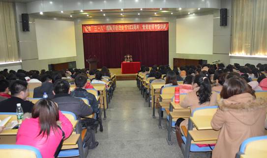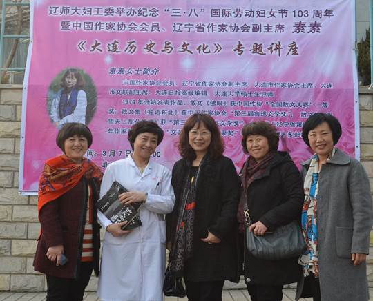 为纪念“三八”国际劳动妇女节103周年,2013年3月7日下午,辽师大妇女工作委员会特邀著名女作家、中国作家协会会员、辽宁省作家协会副主席、大连市作家协会主席、大连市文联副主席、大连日报高级编辑、大连大学硕士生导师,素素老师来我校做《大连历史与文化》专题讲座。全校妇工委委员、各单位工会主席、全校女教职工代表、女大学生代表300多人到场听了讲座。大会由辽师大妇工委主任杨华主持。