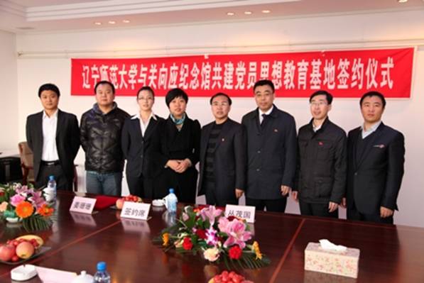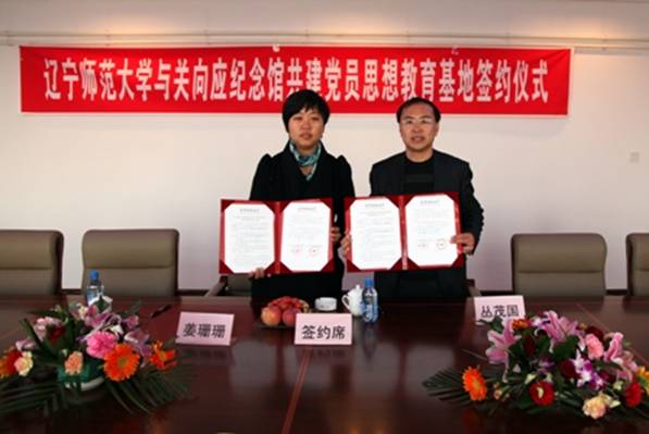 她高度评价了与我校共建教育基地的重要意义,并希望以此为契机,广泛传播向应精神,不断推进社会主义核心价值体系建设。金州新区向应街道副主任、关向应纪念馆馆长姜珊珊同志,辽宁师范大学党委组织部部长丛茂国同志共同为基地揭牌并举行了签约仪式。