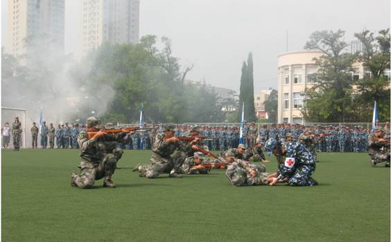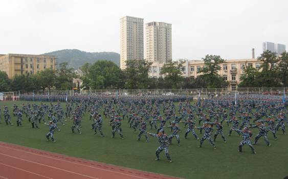 全体参训学生组成的军训方队在解放军进行曲中,迈着整齐有力的步伐通过了主席台,向教官和老师们汇报两周以来的军训成果。
