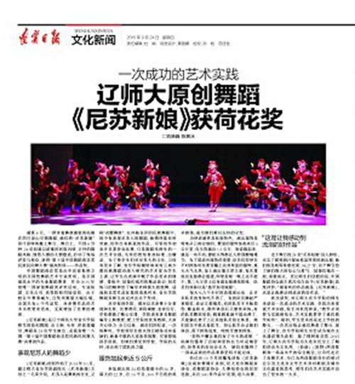 我校原创舞蹈《尼苏新娘》在“第十届中国舞蹈荷花奖民族民间舞大赛”中荣获最高奖项作品奖后,引起社会各界广泛关注。《辽宁日报》《大连日报》等纸质媒体都第一时间进行了报道,多家网络媒体进行了转载。近日,《辽宁日报》以《辽师大原创舞蹈〈尼苏新娘〉获荷花奖》为题对此进行了深度报道,再现了我校音乐学院师生创作、排练舞蹈的艰辛过程,认为这是我校师生一次成功的艺术实践。