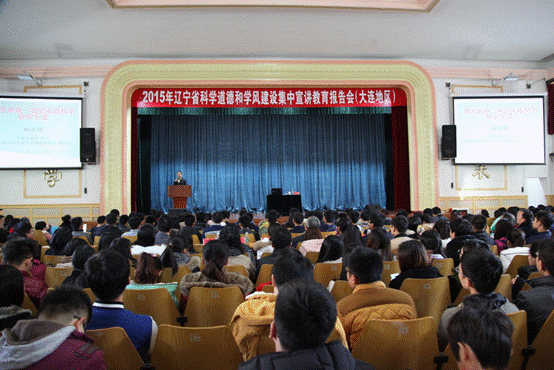 11月17日上午,我校黄河路校区北院礼堂座无虚席,2015年辽宁省科学道德和学风建设集中宣讲教育报告会在此举行,中国科学院大连化学物理研究所副所长杨学明院士应邀作专题报告。报告会由大连市科协副主席李敏主持。