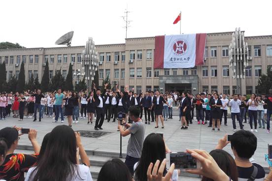 《青春修炼手册》《小苹果》《FANTASTIC BABY》《BEAT IT》《UPDOWN FUNK》等乐曲热烈欢快的旋律、师生们热情洋溢的青春身影,深深地吸引、感染了众多师生。他们驻足观看,为场上的精彩表演呐喊助威,掌声、欢呼声此起彼伏。“快闪”接近尾声之际,师生们齐声高唱《辽宁师范大学校歌》,用最热情、最嘹亮的歌声为母校第65个生日送上最真挚的祝福。