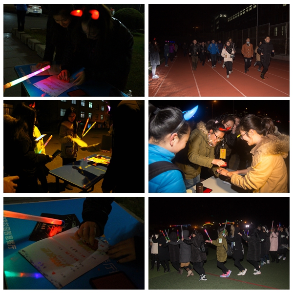 荧光夜跑的路线经过精心规划,选取两校区标志性建筑物或景观作为站点,沿途有工作人员指引。同学们头戴发光饰品,手持荧光棒和邀请函,每到一处站点都要盖章,内容为我校“一训三风”,旨在以此方式提升广大青年学生荣校、爱校的品质。