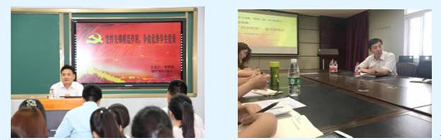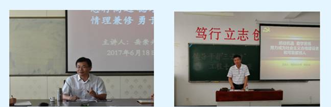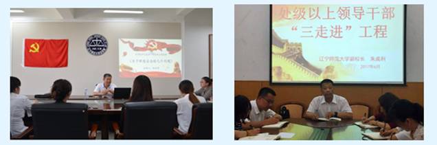 “七一”前夕,根据学校党委印发的《关于推进学校“两学一做”学习教育常态化制度化的实施意见》和《中共辽宁师范大学委员会关于开展“处级以上领导干部‘三走进’工程”建设的工作方案》等文件要求,学校领导带头学习党章党规,深入学习习近平总书记系列重要讲话精神,时刻以“四个合格”标准严格要求自己,不断增强“四个意识”,在“两学一做”学习教育中,坚持领导带头,以身作则,当标杆,做示范,以上率下,为基层党支部讲授专题党课。