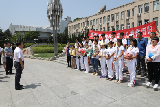 7月26日中午,参加2019年辽宁省大学生田径比赛的辽宁师范大学体育健儿载誉归来,校党委书记宫福清,校长李雪铭,校领导李培山、刘向军、朱成利、岳崇兴、丛茂国及相关单位负责同志在主楼前广场举行仪式,欢迎体育代表团凯旋归来。