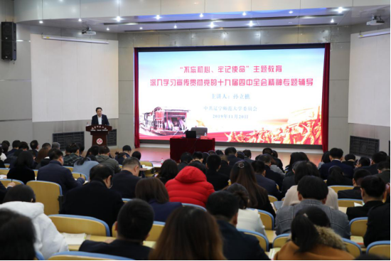 为深入推进“不忘初心、牢记使命”主题教育,全面学习宣传贯彻党的十九届四中全会精神,学校党委于11月20日下午在学术报告厅举行党委理论学习中心组(扩大)学习暨深入学习宣传贯彻党的十九届四中全会精神专题辅导报告会。省高校主题教育第五联络指导组成员、省教育厅服务业高等教育处处长于洪江同志到会指导,学校领导班子全体成员、副处级以上领导干部、党支部书记代表和党员代表300余人参加了报告会。会议由校党委书记宫福清主持。