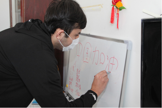 来自乌兹别克斯坦的留学生别克,现场用刚学到的汉语写到“中国加油!武汉加油!”。