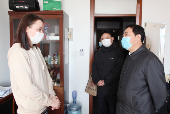2月17日上午,学校疫情防控工作领导小组组长、校党委书记宫福清、校长李雪铭来到留学生公寓看望在校留学生,发放了防护用品,并指导疫情防控工作。副校长苑晓杰、国际教育学院党政领导以及校疫情防控领导小组办公室负责同志陪同慰问指导。