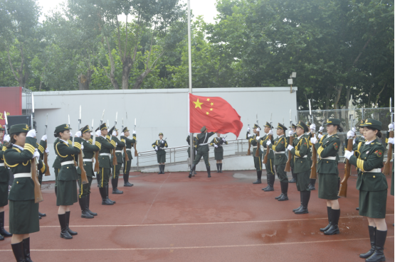 国旗护卫队队员迈着铿锵有力的步伐护卫着五星红旗走过师生方队,走向国旗台。伴随着雄壮的《义勇军进行曲》,全场师生齐声高唱国歌,鲜艳的五星红旗冉冉升起。