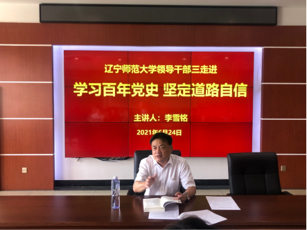 6月24日下午,按照学校党委《中共辽宁师范大学委员会关于开展“处级以上领导干部‘三走进’工程”建设的工作方案》要求,学校党委书记、博士生导师李雪铭教授来到地理科学学院,为所对接的研究生第一党支部党员讲授专题党课。本次党课的主题是“学习百年党史,坚定道路自信”。参加此次党课学习的有地理科学学院党委副书记马闯及研究生第一党支部全体党员。