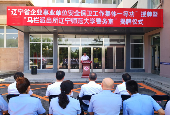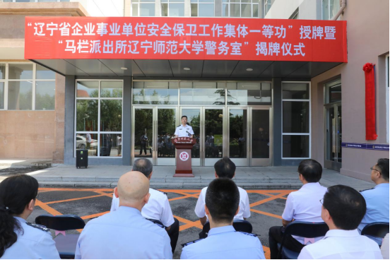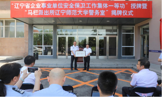 6月18日,“辽宁省企事业单位安全保卫工作集体一等功”(以下简称“集体一等功”)授牌暨“马栏派出所辽宁师范大学警务室”(以下简称“警务室”)揭牌仪式在文科二号楼前广场举行。大连市公安局内保支队支队长贾晓峰,大连市沙河口区副区长、区公安分局党组书记、局长张敏军,学校党委书记李雪铭,校长苑晓杰,大连市公安局内保支队和大连市公安局沙河口公安分局部分领导,学校相关单位负责人和学生代表出席本次活动。仪式由副校长丛茂国主持。