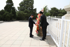 下午,在辽沈战役纪念馆园区,掩映在一片苍翠之中的辽沈战役革命烈士纪念塔巍然耸立,气氛庄严肃穆。在革命烈士纪念塔前,研学组一行举行了向在辽沈战役中英勇牺牲的革命烈士敬献花篮仪式。李雪铭上前仔细整理缎带,并向革命先烈致以崇高的敬意,全体人员肃立,向革命烈士行三鞠躬礼,并瞻仰烈士纪念塔,深切缅怀英烈的不朽功绩,表达继往开来、接续奋斗的坚定信心。