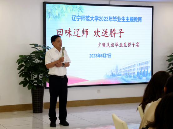 李雪铭书记为毕业生送上祝福,他动情地表示:“难忘少数民族同学们在球场上的飒爽英姿,在朋友圈经常看到同学们能歌善舞画面,校园的文体活动因为少数民族同学的参与而显得更加多姿多彩。临别之际对同学提出三点希望:一是希望少数民族毕业生铭记“厚德博学、为人师表”的校训,在未来的工作岗位上展现辽师人的风采,以“永远在路上”的奋斗者姿态,保持学习,保持热爱,执着教育事业;二是希望同学们坚定理想信念,铸牢中华民族共同体意识,永远听党话跟党走,不负青春、不负韶华,为建设社会主义现代化强国贡献青春力量;三是希望同学们常回母校看看,无论你们走到哪里,母校永远是同学们的坚强后盾。借此机会祝福全体2023届毕业生毕业快乐,前程似锦!”