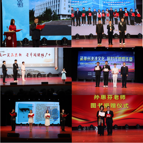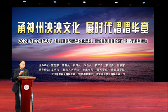 3月27日上午,由校党委宣传部、教务处、科研处、学生处、校工会、校团委、图书馆共同主办的“承神州泱泱文化,展时代熠熠华章——2024年辽宁师范大学贯彻落实习近平文化思想,建设最美书香校园”读书季活动开幕式在西山湖校区影视艺术学院剧场隆重举行。石竹青副校长、相关职能部门领导及部分师生代表近200人参加了开幕式。开幕式现场分为开幕仪式和首场报告两个环节,由图书馆杨春宇馆长、李海瑞副馆长、馆员孙丽主持。