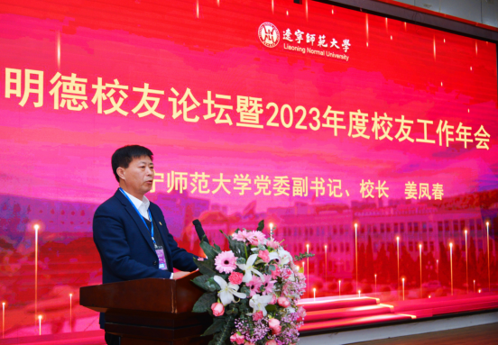 校长姜凤春致欢迎辞。他代表学校全体师生对长期以来心系辽师、情注母校的各位校友和来宾表示热烈的欢迎和衷心的感谢,并向各位来宾和校友们简要介绍了近年来学校的发展变化和取得的一系列显著成就。他指出,回首2023年,全体辽师人踏歌而行,沐浴着新时代春风,全面落实立德树人根本任务,各项事业蒸蒸日上、欣欣向荣,正向着教师教育特色鲜明的高水平综合性大学建设目标阔步前行。他强调,母校的事业发展,离不开历届校友的热心帮助和倾力付出,母校感谢广大校友的付出和支持。他指出,把各位校友邀请回来,除了向各位报告母校发展取得的卓越成绩,也希望所有校友进一步增强对母校认同,增强校友团结,积极参与母校的发展建设。同时,学校也会积极宣传校友、凝聚校友、服务校友、赋能校友、依靠校友,努力打造学校和校友发展共同体,汇聚成推动学校发展的磅礴力量。