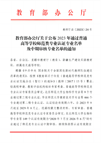 近日,教育部印发《教育部办公厅关于公布2023年通过普通高等学校师范类专业认证专业名单及中期审核专业名单的通知》(教师厅函〔2023〕24号),我校计算机科学与技术、教育技术学、历史学、英语四个专业通过中学教育第二级专业认证,认证结论有效期六年,自2023年9月起至2029年8月止;2020年首批通过二级认证的汉语言文学、数学与应用数学两个专业通过中期审核,认证结论继续保持有效期,自2020年7月起至2026年6月止。目前,我校已有13个专业通过师范类专业第二级认证。
