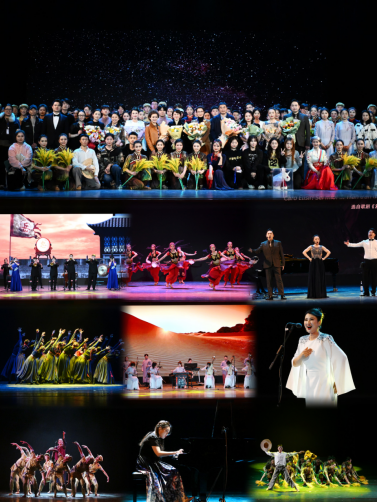 第一场“弦歌不辍 蔚然新声”综合晚会涵盖民乐合奏、舞蹈、声乐等丰富的舞台表演形式,集可听性、艺术性、生动性于一体。原创舞蹈《红色记忆》多层次展现抗美援朝气势磅礴的历史画卷,《风起稻浪》刻画了“共和国勋章”获得者袁隆平“禾下乘凉梦、一梦逐一生”的济世情怀;民族器乐合奏《丝绸之路》奏响了共建“一带一路”的金色十年和光明前景,《将军令》传达了“八千里路云和月”的家国情怀;民族舞蹈《大漠之花》《牧马姑娘》描绘了各民族幸福的生活场景;钢琴独奏《黄河》奏响母亲河波澜壮阔的壮美篇章;声乐作品兼顾中西,歌剧《江姐》选段《五洲人民齐欢笑》展现了共产党员钢铁般的意志,西方经典歌剧选段声情并茂、别具一格。整场晚会精彩纷呈、高潮迭起,师生用精湛的表演、诚挚的情感和正向的价值引导,讲好中国故事,传播中国声音。