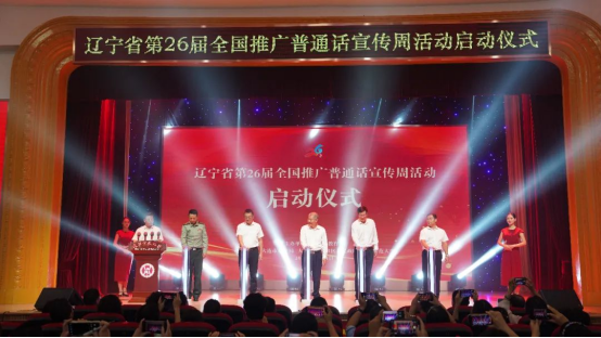 刘向军、刘宝生等五位领导嘉宾共同登台按动启动柱,辽宁省第26届全国推广普通话宣传周活动正式启动。