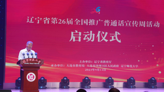 9月14日上午,辽宁省第26届全国推广普通话宣传周活动启动仪式在我校黄河路校区举行。本次活动主题为“推广普通话,奋进新征程”。启动仪式由省语言文字工作委员会、省教育厅主办,由辽宁师范大学、大连市教育局、沙河口区政府共同承办。辽宁省教育厅义务教育处处长、省语委办主任刘宝生,辽宁师范大学副校长刘向军,大连市沙河口区副区长宋红英,省委宣传部、省民族和宗教委、省人力资源社会保障厅、省文化和旅游厅、省广电局、省军区政治工作局、团省委等部门相关负责同志,各地市语委办、大连市各县(市、区)教育行政部门负责同志,以及部分师生代表出席启动仪式。活动由大连市教育局副局长赵刚主持。
