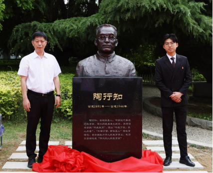 校长姜凤春及学生代表战秉政为陶行知像揭幕。为感恩母校,2023届毕业生自愿捐款筹资筑建了陶行知青铜塑像,饱含着全体2023届毕业生对母校的深厚情谊。塑像由美术学院副院长颜海强老师带领学院师生精心设计塑造而成,整座塑像庄重大气。