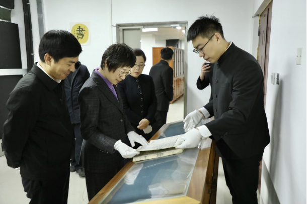 罗文波校长指出,学校党政领导一贯关注图书馆的高质量发展。学校近来逐年配置专项资金,进行图书馆软硬件设施的改善,实现了智慧化图书馆一期建设的软件升级改造、黄河路校区图书馆未来学习中心一期工程建设,让图书馆成为师生每天乐于光顾的打卡地,勤学、乐学、善学蔚然成风,有效提升了图书馆藏资源的利用率。学校将结合实际循序渐进地持续加大对图书馆的支持力度,建设未来学习中心二期、三期工程。图书馆要不断探索文献资源建设、信息咨询、AI服务转型、古籍保护、阅读推广等工作新路,以冲击国家古籍保护中心和深入开展全民阅读、智慧化图书馆建设等工作为契机,打造平台、与时俱进、守正创新,促进图书馆文献资源建设、大学文化建设的高质量发展,努力建成特色鲜明、勇于担当、积极引领、具有辐射影响力的现代化智慧化图书馆。罗文波特别调研了古籍保护的消防工作。
