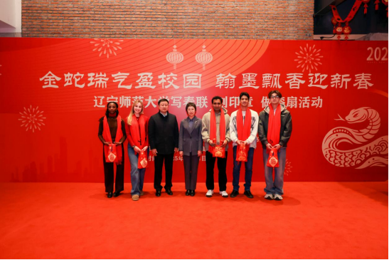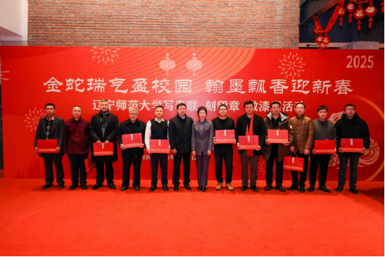 近日,在2025年春节即将到来之际,为弘扬中华传统文化,增添校园节日氛围,丰富师生课余生活,我校举办了“金蛇瑞气盈校园,翰墨飘香迎新春”——写春联、刻印章、做漆扇活动。此次活动共分为“携”福、“赚”福、“祈”福和“接”福四个环节。校党委书记刘宏,副校长曹锡顶出席了活动。大连市文联副主席、书法家协会主席高玉刚,大连市书法家协会副主席于书藴、阎海波,大连市书法家协会监事长许崇君,大连市书法家协会理事王刚,美术学院退休教师栾传益,法学院副院长刘耀东,外国语学院范佳程,文学院王庭发,美术学院谷翠峰,以及师生代表、留学生代表参加了活动。