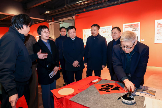 在“携福”环节,校领导们首先来到书法家们身边,驻足观看他们挥毫泼墨,书写春联。书法家们笔锋灵动,一幅幅寓意吉祥、充满祝福的春联跃然纸上,引得现场师生连连赞叹。刘宏书记不时与书法家们交流,对他们的精湛技艺表示赞赏,并亲自接过刚写好的春联,细细品味其中的韵味。