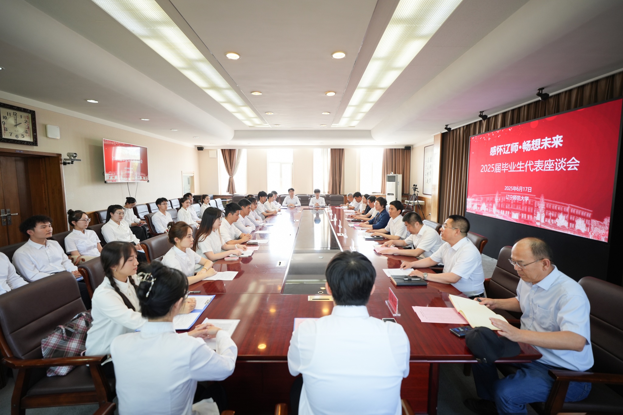 座谈会上,罗文波与同学们一同回顾了近年来辽师在学科建设、人才培养、校园文化等方面取得的显著成就,充分肯定了同学们在专业学习、科研创新、社会实践等方面取得的丰硕成果,赞扬了同学们在校期间表现出的乐观向上、拼搏进取的精神品质,也感谢同学们对学校各项工作的理解与支持。他鼓励同学们在会上敞开心扉、畅所欲言,学校将认真研究同学们提出的每一条建议,进而转化为推动学校高质量发展的具体举措,也希望同学们在毕业后继续关注母校的发展建设。