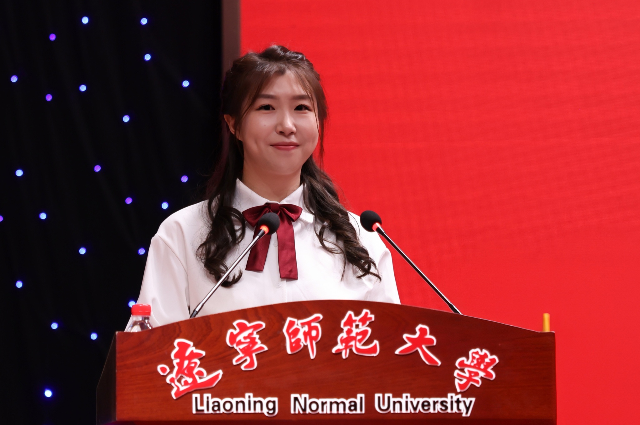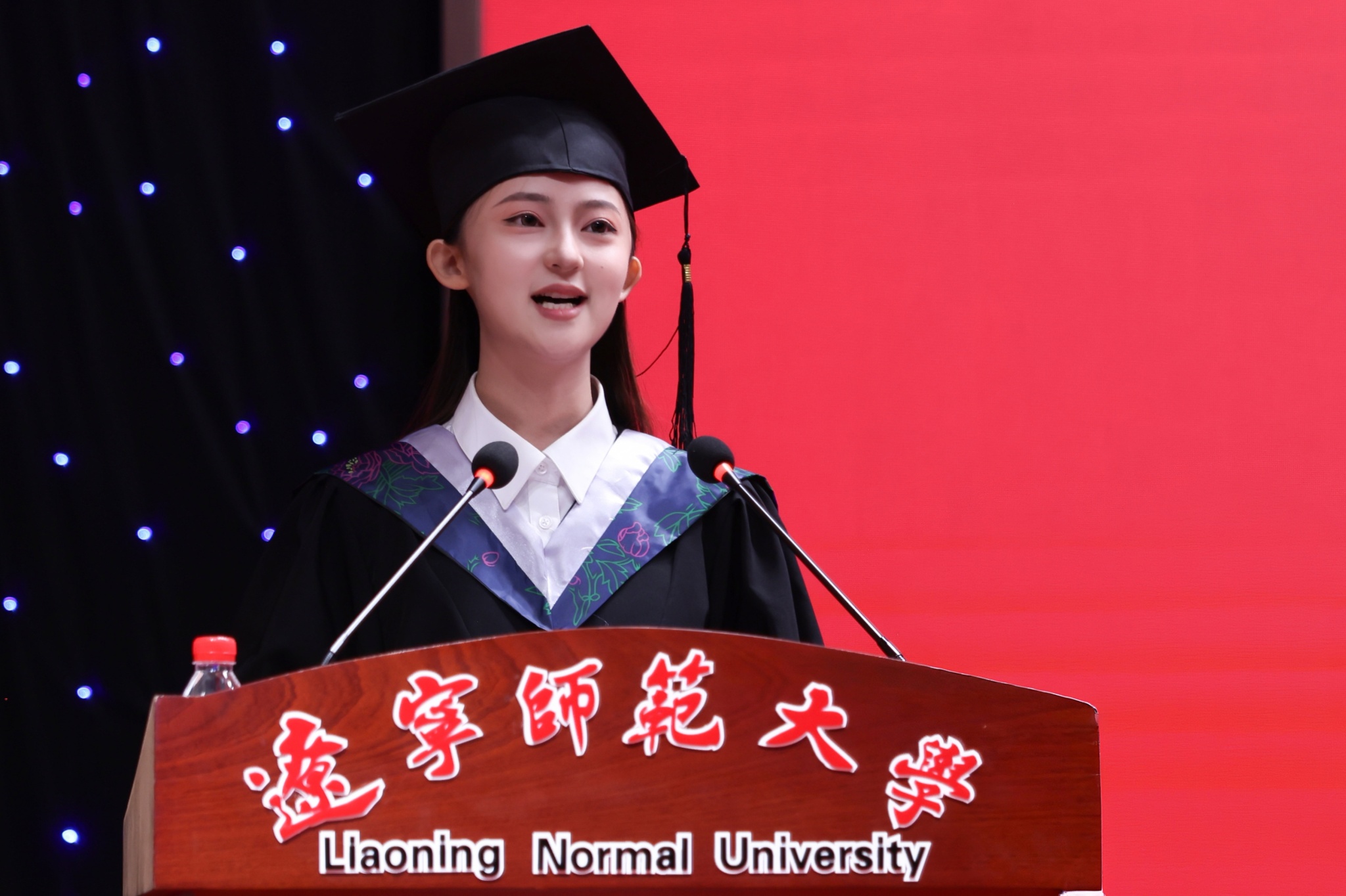外国语学院2023级硕士研究生孙歆茹同学代表全体在校生发言,向毕业生送上祝福,她表示,学长学姐是榜样,将传承校训精神,在学业与实践中奋进,续写辽师荣光。