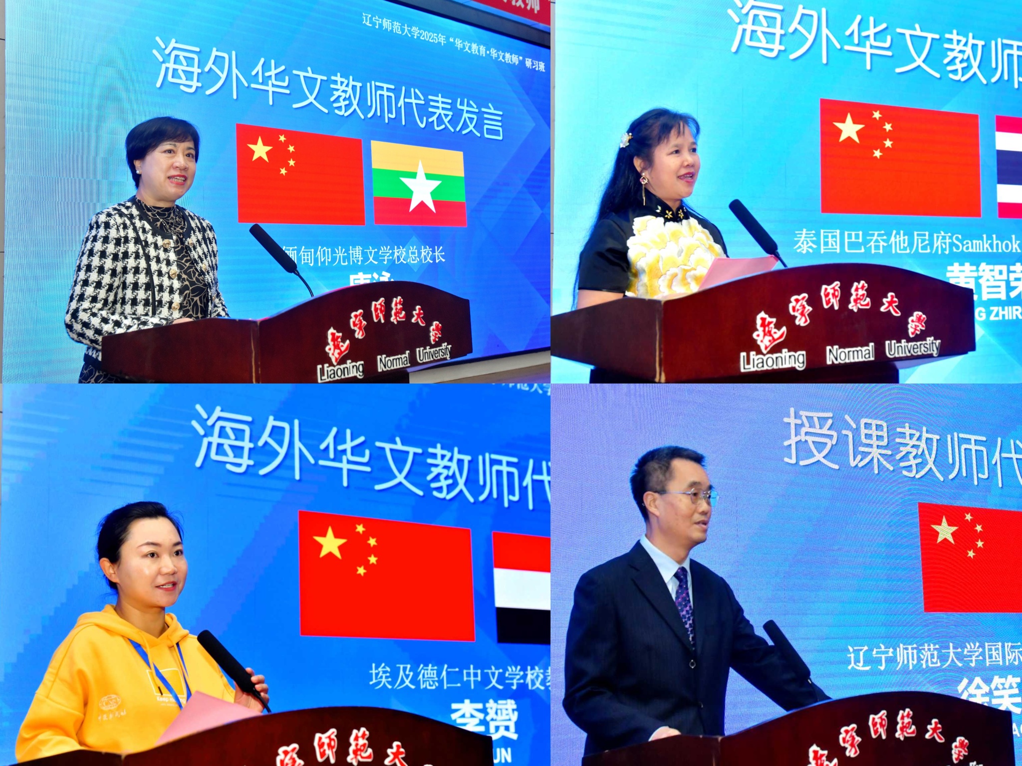 三位华文教师代表依次发言。缅甸仰光博文学校康泳总校长提及海外华文教育面临教学方法更新、教师能力提升等挑战,认为此次研习班是成长契机,将把所学带回校园。泰国巴吞他尼府三扣学校黄智荣老师表示,自己是带着泰国孩子们对华文的好奇与热爱,也带着教学中的困惑与挑战而来,渴望把最前沿的教学方法、最地道的语言文化带回泰国。埃及德仁中文学校李赟老师将培训比作“及时雨”与“充电桩”,用十二字心得与学员共勉,盼大家带“法宝”回国让课堂更鲜活。徐笑一教授作为授课教师代表发言,他承诺授课团队将秉承“厚德博学,为人师表”的校训,毫无保留地传授专业知识与教学方法,助力学员提升教学能力。