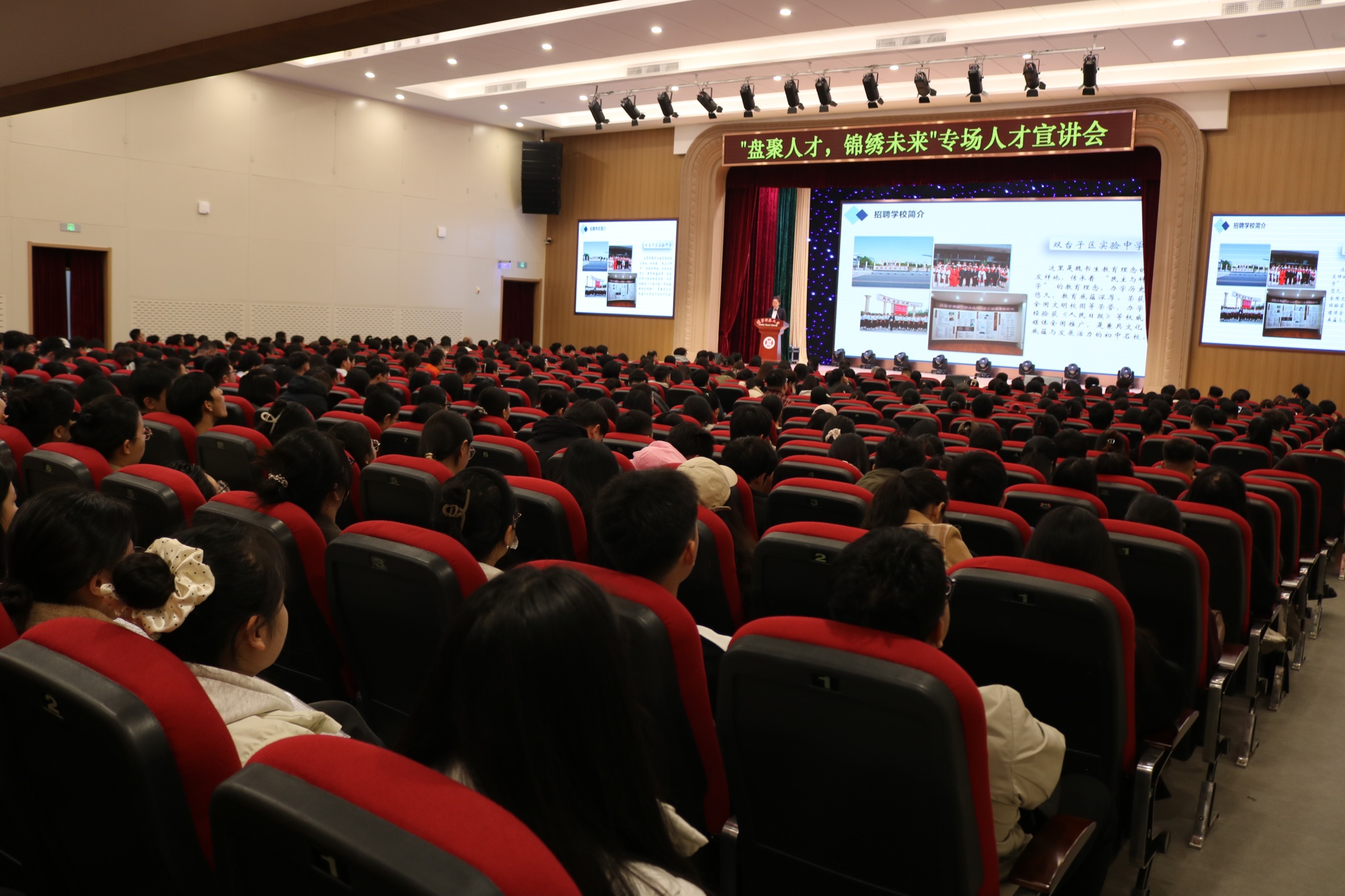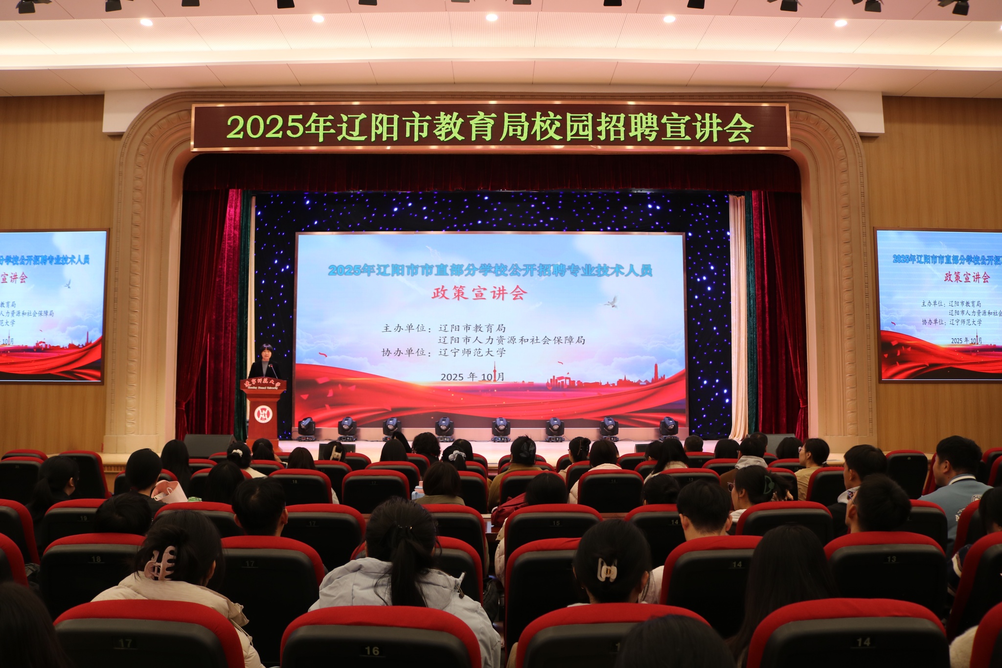 招聘会前,盘锦市、辽阳市教育局分别在我校黄河路校区礼堂召开政策宣讲会。在盘锦市教育局的宣讲会上,徐昭峰代表学校致辞,对教育局送岗进校的举措表示感谢。他强调,学校将以此次招聘会为重要契机,持续推进校地合作走深走实,结合当地教育发展需求优化人才培养方案,为地方基础教育事业高质量发展注入“辽师力量”。在辽阳市教育局的宣讲会中,其教育系统代表同样从城市区位优势、人文历史底蕴、教育资源布局、人才政策保障等维度全方位展示当地魅力。两市教育系统代表均向我校学子发出诚挚邀约,欢迎大家加入当地教育队伍,在教书育人岗位上实现价值。