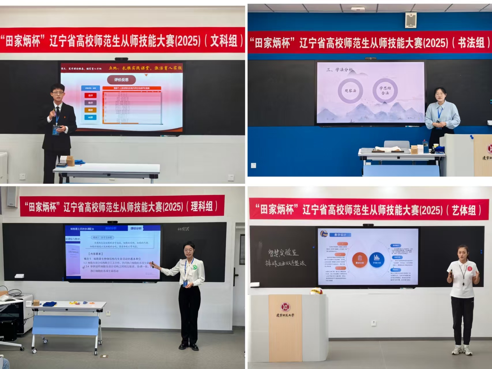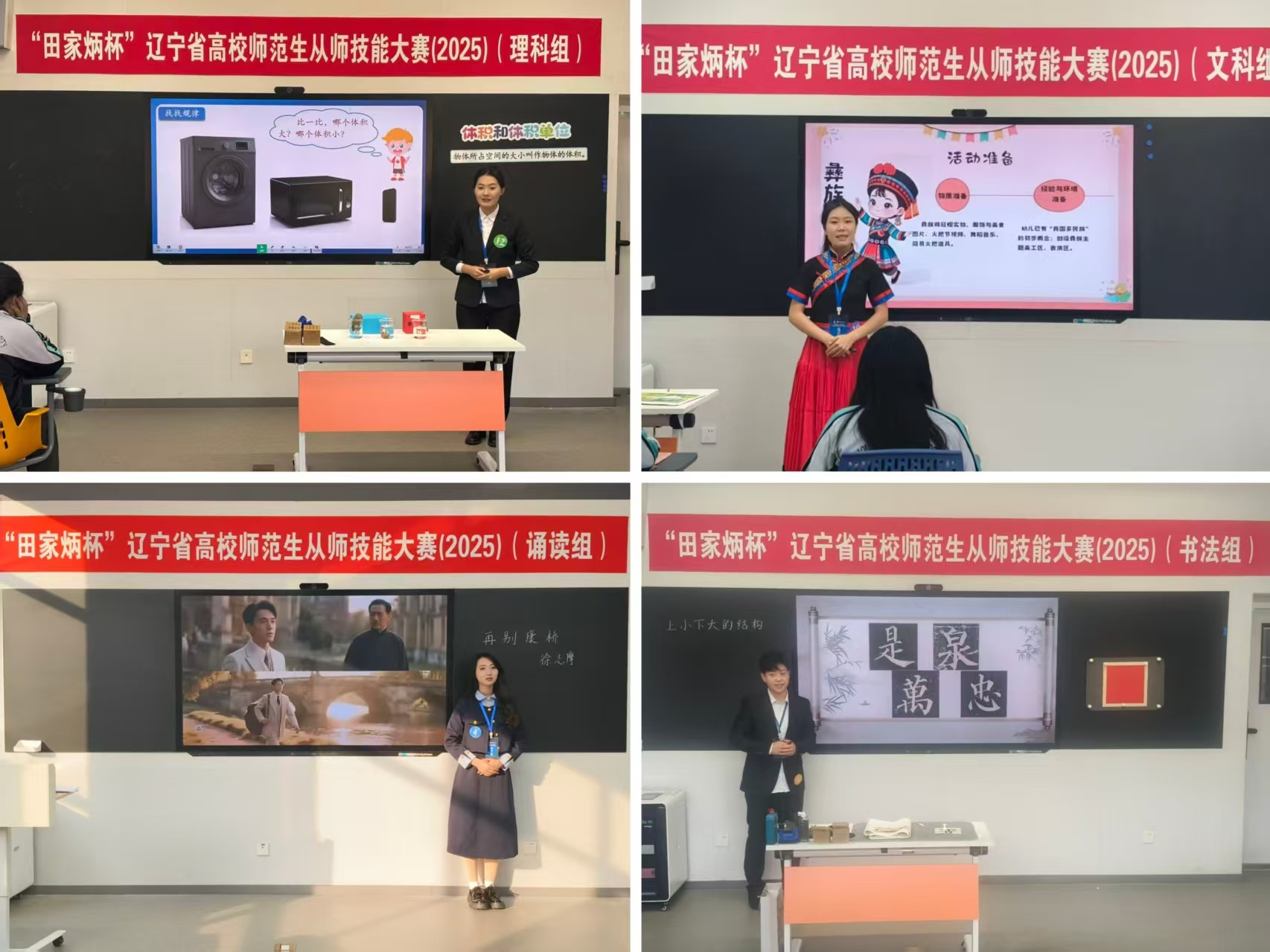 本届大赛历时六个月,分为校级初赛和省级决赛两个阶段,涵盖本科院校和高职高专院校两大赛道,设理科组、文科组、艺体组、书法组、诵读组共五个组别。11月15日举行的决赛吸引了来自18所院校的163名选手同台竞技,同学们以饱满热情、扎实功底和创新设计,生动展现了新时代师范生的优秀专业素养与育人情怀,从精准落实新课标理念的教学设计,到灵活运用AI技术的智慧课堂展示;从融合辽宁红色资源的思政教育创新,到结合地方非遗文化的美育课程开发,每一个环节都生动诠释了对为党育人、为国育才使命的深刻领悟与躬身实践。