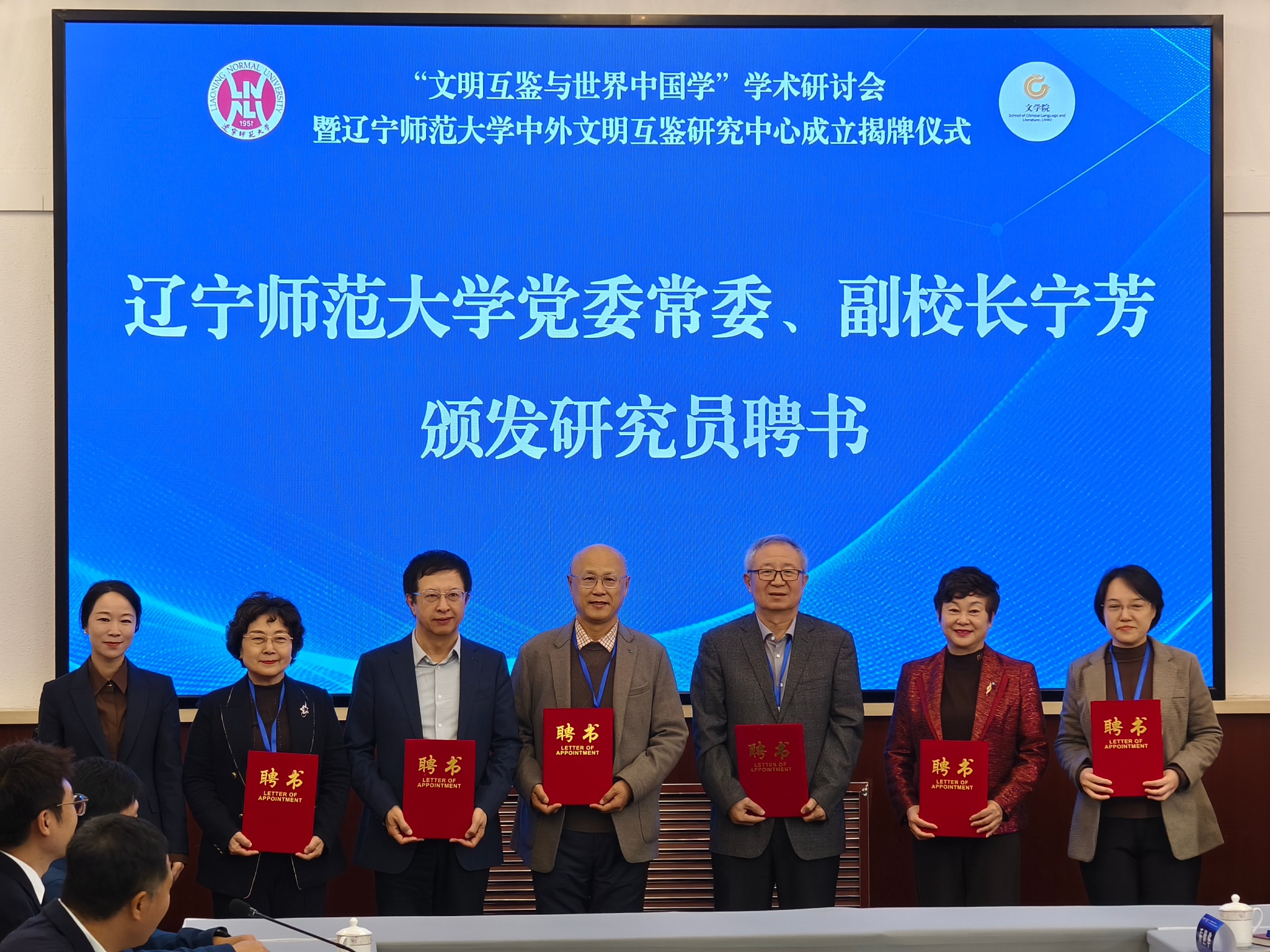 致辞环节后,举行辽宁师范大学中外文明互鉴研究中心揭牌仪式。在与会嘉宾的共同见证下,宁芳副校长与厦门大学李无未教授共同为研究中心揭牌。随后,宁芳副校长为中心首批兼职研究员蔡美花教授、李无未教授、刘洪涛教授、马金科教授、孙惠欣教授、孟凯研究员颁发聘书。
