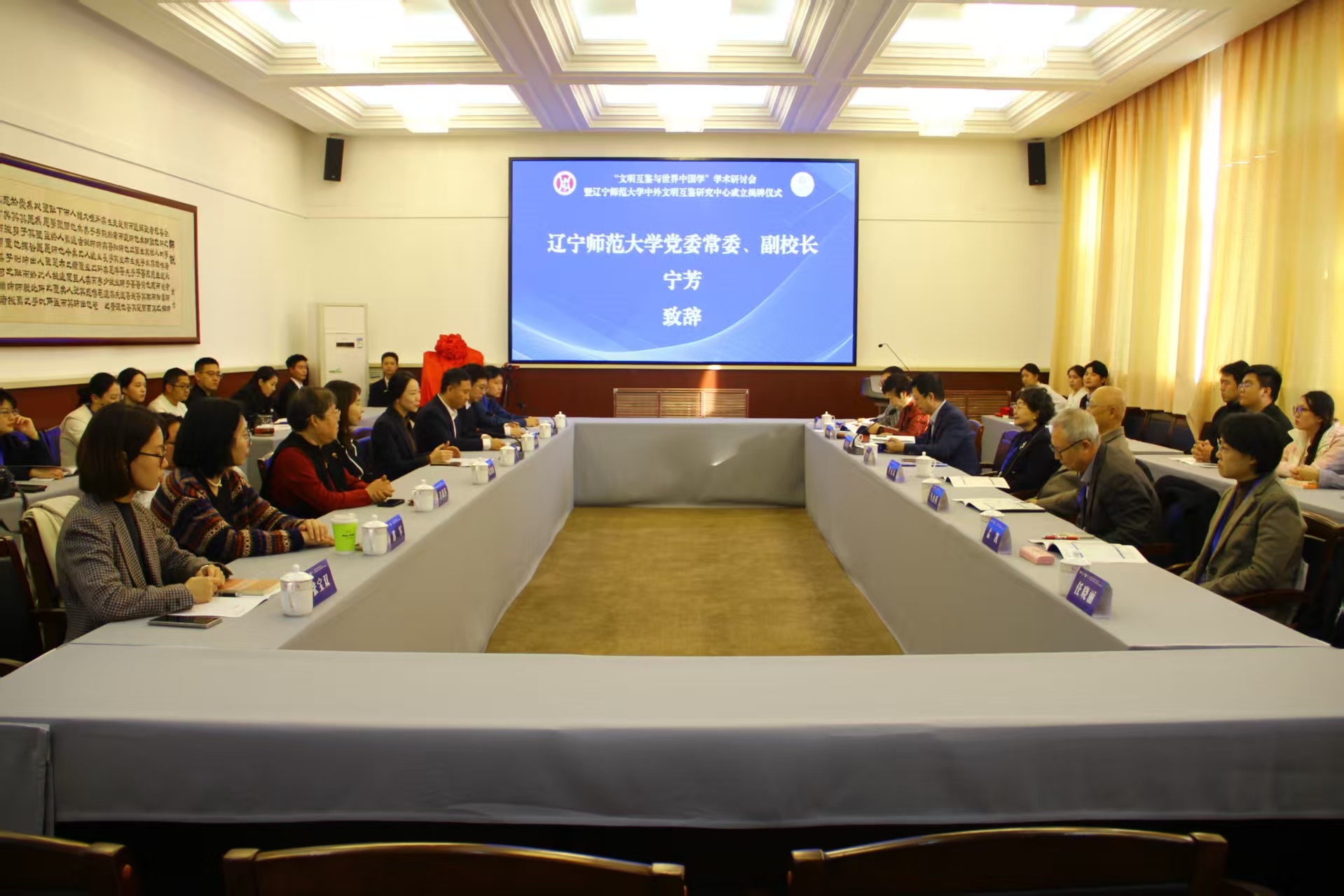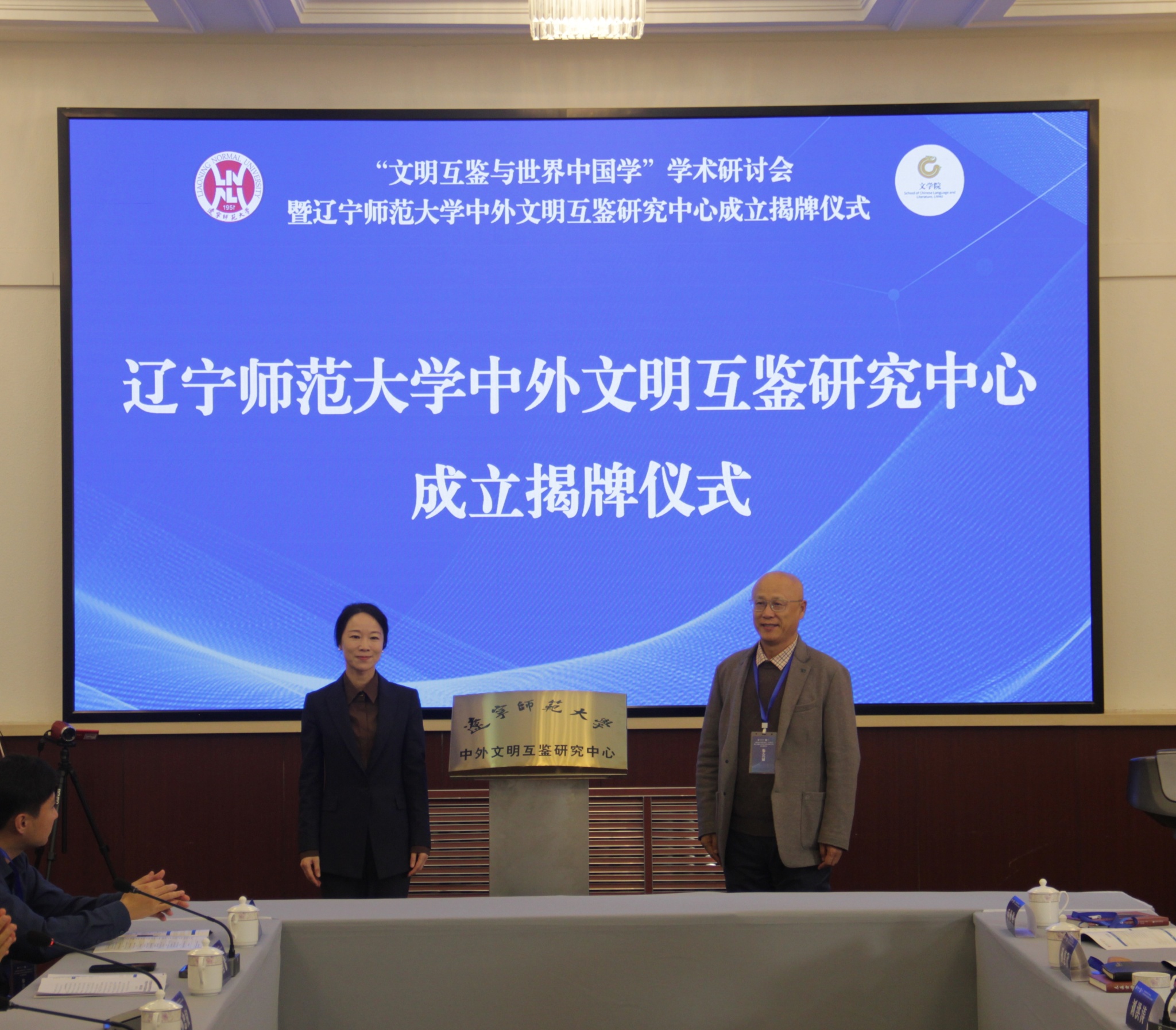11月15日,“文明互鉴与世界中国学”学术研讨会暨辽宁师范大学中外文明互鉴研究中心成立揭牌仪式在辽宁师范大学国际交流中心隆重举行。辽宁师范大学党委常委、副校长宁芳出席会议并致辞,湖南师范大学东北亚研究中心主任蔡美花教授,厦门大学国际汉语史研究中心主任李无未教授,中国比较文学学会副会长、北京师范大学刘洪涛教授,延边大学《东疆学刊》原主编马金科教授,大连大学人文学部副主任孙惠欣教授,北京语言大学语言研究中心主任孟凯研究员,大连外国语大学科研处原处长任晓丽教授,大连外国语大学韩国语学院副院长徐俊教授,辽宁师范大学文学院比较文学与世界文学学科带头人乔世华教授以及相关专业师生代表出席本次活动。开幕式由辽宁师范大学文学院党委书记孙忠权主持。