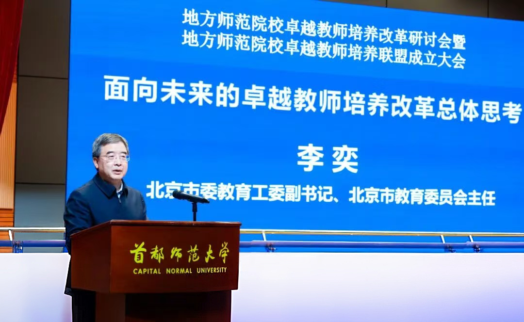北京市委教育工委副书记、市教委主任李奕介绍,为共同应对基础教育发展新需求,深化教师教育供给侧结构性改革,北京市率先倡议并联合多所地方师范院校共同成立卓越教师培养联盟,旨在汇聚地方师范院校贴近一线、扎根实践的共同优势,以基础教育实际需求为导向,协同创新教师培养模式,强化师范生的实践能力与综合育人素养等。首都师范大学作为首都教师教育的重要基地,期待与各地方师范院校共同携手,围绕学段贯通、课程融合、科技赋能等新趋势,合作探索卓越教师培养新路径,共同为基础教育高质量发展构建高水平、重实践的师资培养新生态。下一步,将以“系统重构、跨界协同”为改革基调,提出“浸润实践、标准引领、全程贯通”理念,构建“嵌入式—进阶式—认证制”教师教育实践体系,推动实现三大转变:从“理论主导”转向“知行深度融合”,从“分段培养”转向“职业全程贯通”,从“高校主责”转向“多元协同共育”,形成可复制推广的“首都方案”与“联盟方案”。