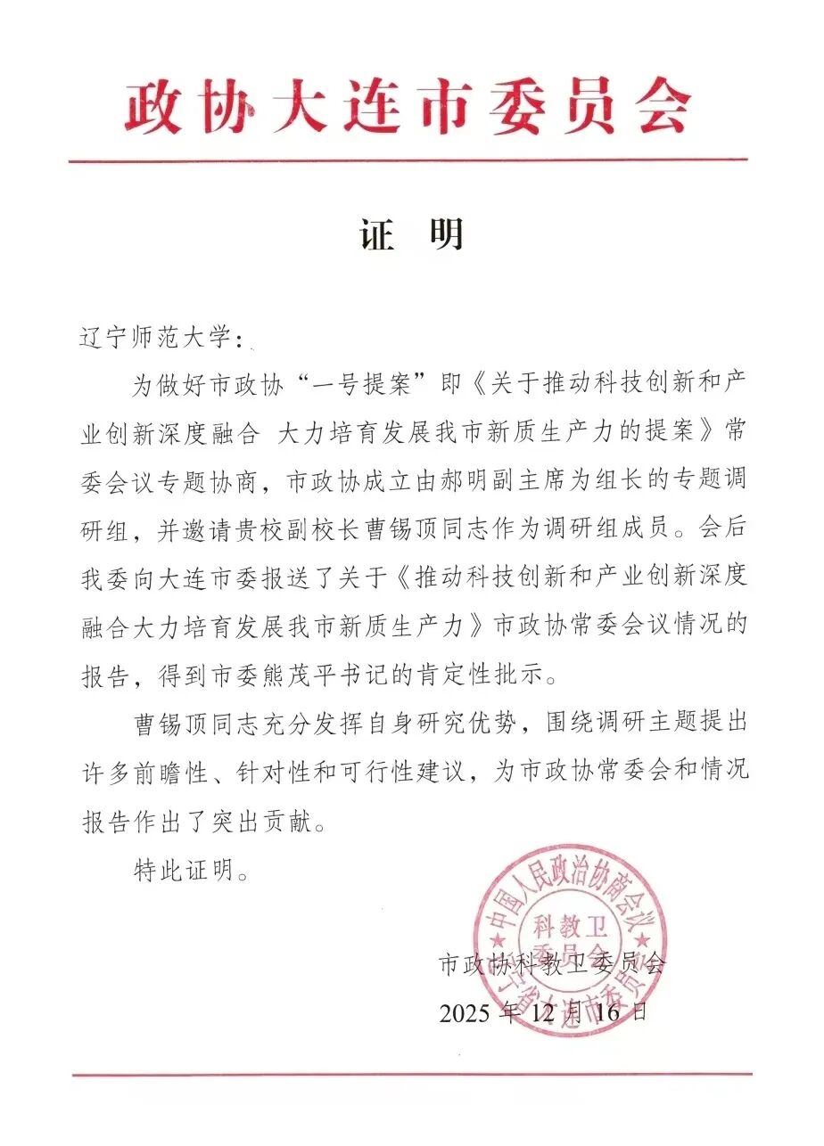 此次履职是辽宁师范大学服务地方发展的生动实践。曹锡顶副校长通过政协这一重要平台积极传递“辽师声音”、贡献“辽师智慧”,为校地协同推进城市创新发展搭建起坚实桥梁。