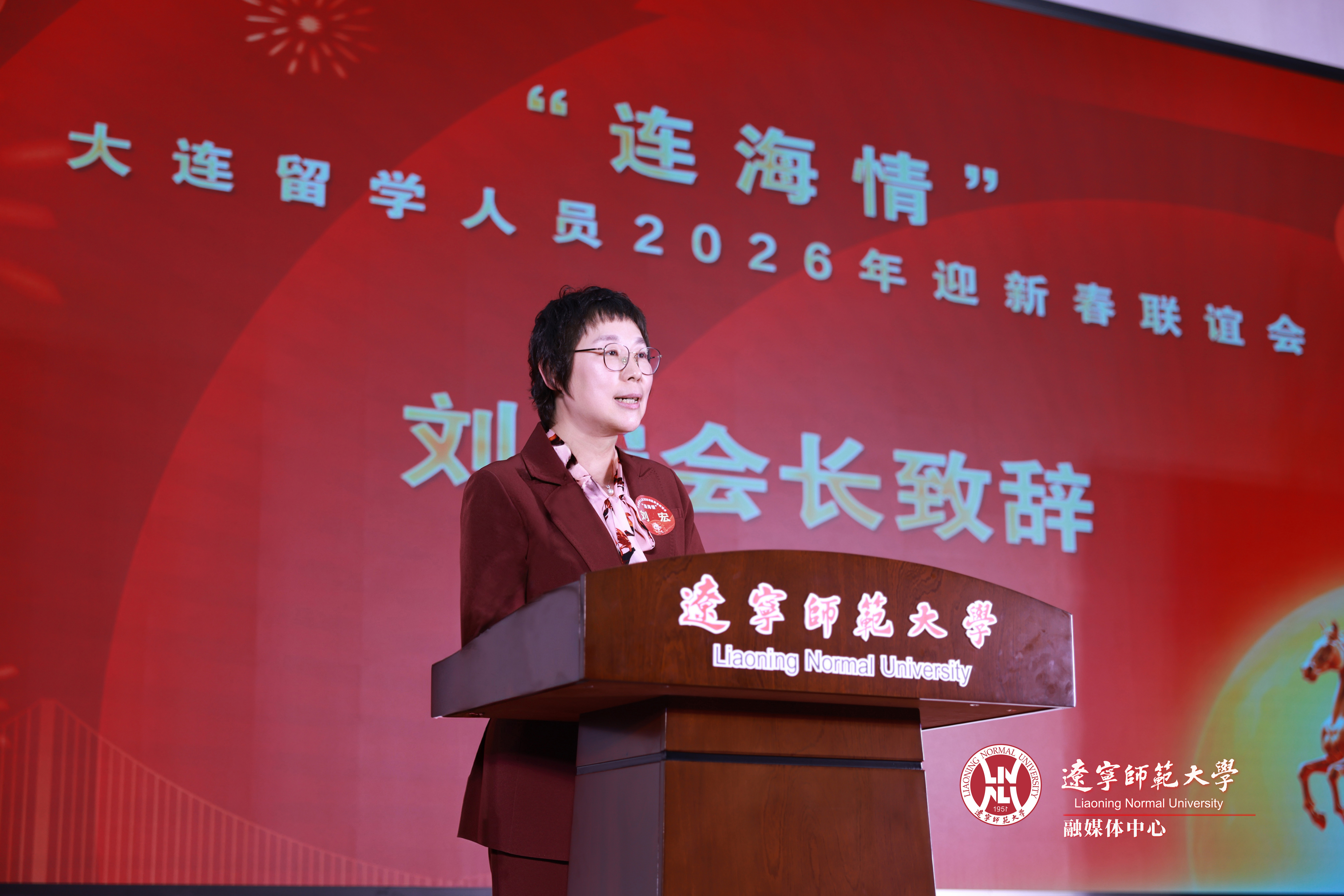 活动伊始,刘宏发表致辞。她代表市欧美同学会与辽宁师范大学,向海内外留学人员致以新春的诚挚祝福,勉励广大留学人员牢记习近平总书记致欧美同学会成立110周年贺信精神,传承留学报国光荣传统,将个人理想融入国家发展与大连振兴大局。刘宏表示,辽宁师范大学作为大连市欧美同学会会长单位,始终致力于打造留学人员“团结之家、奋斗之家、温暖之家”,未来将持续发挥高校资源优势,为留学人员创新创业、施展才华提供更广阔的平台,助力大连建设成为更具吸引力的人才高地。刘宏强调,广大留学人员要坚持强化思想政治引领,坚持服务改革发展,坚持守正创新,在充分发挥“人才库、智囊团、生力军”作用中坚持以下四个方向:一是建强服务国家战略的大连“人才库”。二是打造支撑城市治理现代化的高端“智囊团”。三是培育深耕民间交往的务实“生力军”。四是筑牢赓续报国传统的“连海情”精神家园。