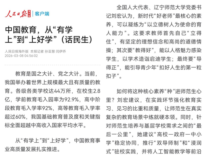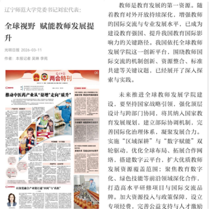 教育部官方公众号《微言教育》登载了刘宏书记的专访,主要聚焦自己带上两会的关于教师教育改革和全球教师发展学院的建议内容。她谈到在建设教育强国中,面临教师教育改革,要推动师范院校与高水平大学开展“强强联合”,高水平大学发挥其在学科及师资方面的资源优势,师范院校要充分发挥在教育学、心理学的学科传统,共同推动教师教育高质量发展。同时,她呼吁加大投入力度,建设“全球教师发展学院”,吸引更多的教师来交流学习,向世界阐释中国特色教育模式,助力打造具有全球影响力的世界教育中心。