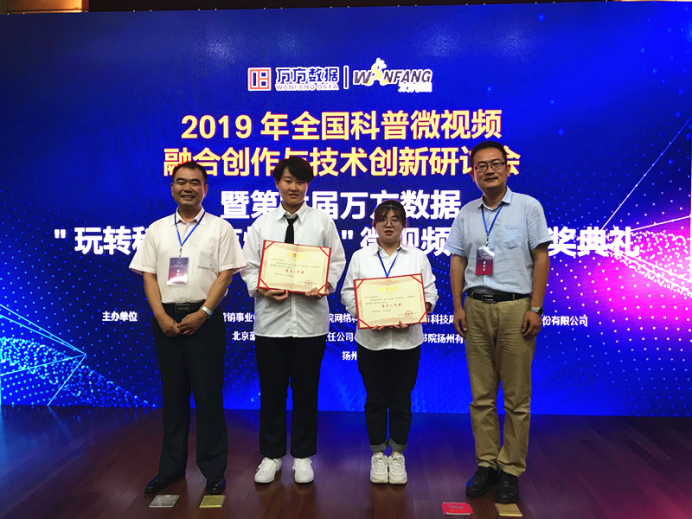 7月5日,在科学技术部、中国科学院联合举办的2018年全国优秀科普微视频作品展演活动期间,由科技日报社策划营销事业中心、中国科学院网络科普联盟等主办的全国科普微视频融合创作与技术创新研讨会暨第六届万方数据“玩转科技·点燃梦想”微视频大赛颁奖典礼在扬州市图书馆隆重举行。我校图书馆在众多参赛单位中脱颖而出,荣获“最佳组织奖”。物理与电子技术学院毛英臣、梁雷老师指导吴文婷、鲍萱倩、姜帆、陈恒羽四位同学创作的《北斗卫星导航系统》、《恒星的演化》两部作品荣获“最具人气奖”。