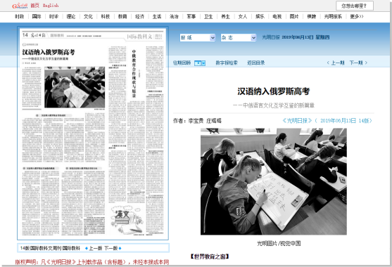我校李宝贵教授在《光明日报》( 2019年06月13日 14版)发表了题为“汉语纳入俄罗斯高考——中俄语言文化互学互鉴的新篇章”的观点文章,他在文章中指出:汉语纳入俄罗斯高考既是新形势下中俄关系纵深发展的必然趋势,也是俄罗斯参与共建“一带一路”的内在需求。与此同时,中俄两国教育界也应该清楚认识到,汉语纳入俄罗斯高考并不是一蹴而就的,纳入进程仍面临着诸多现实挑战。为适应汉语纳入高考带来的汉语学习新动向,有效对接“一带一路”建设衍生的语言人才新需求,未来俄罗斯的汉语教学应该尽快出台统一的汉语教学大纲、对接汉语水平考试(HSK)推进教学统一化、加强培养当地化汉语教师和力拓展语言学习和使用环境。