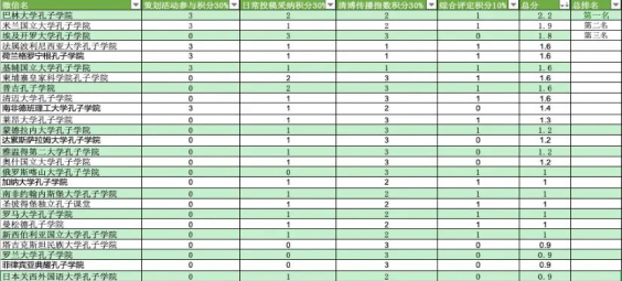 本季度评定主要参考各孔院线上策划活动参与度(占30%)、日常投稿官微采纳情况(占30%)、清博指数排名(占30%)以及稿件创意度(占10%)四个方面。