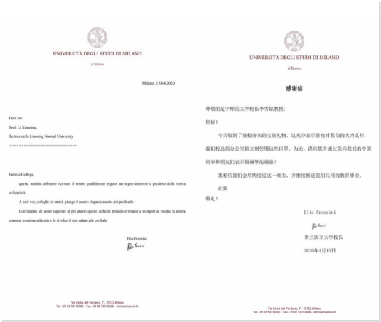 在共同抗击疫情期间,我校为支持米兰国立大学的各项工作,通过米大孔院向米兰国立大学捐赠了500个医用口罩,供大学总部在岗工作人员使用。据悉,米兰国立大学已于4月15日成功接收包裹并将口罩分发给总部人员,傅阳校长(Franzini)给李雪铭校长发来了感谢信,对我校全体师生表示诚挚感谢,希望中意能够尽快度过难关,继续推进共同的教育事业。