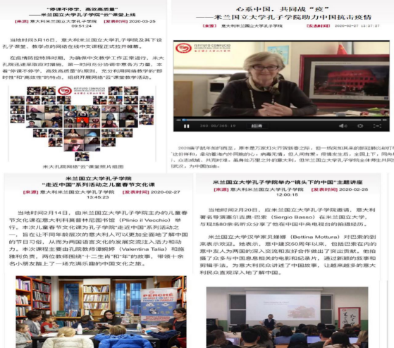当下意大利疫情形势严峻,我校米兰国立大学孔子学院中意方全体教师仍坚持在线工作,为米兰国立大学中文专业本科、硕士研究生、下设高中孔子课堂和汉语教学点高中生及米兰国立大学孔子学院夜校学员开设了30多门网络课程。同时,我校米大院中意方工作人员紧密合作,由意方策划,中方教师录制的中意双语中国俗语、成语故事以及中国抗“疫”宝典等视频和资料在线上提供给孔子学院的朋友们。截止到目前,米兰国立大学孔子学院在社交平台Instagrm上的粉丝超过千人,Facebook上的粉丝达到6000多人。