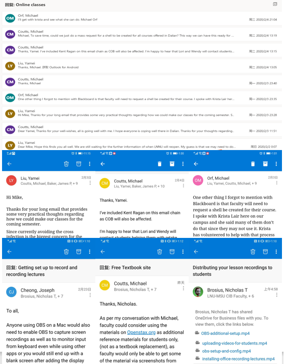 为全面落实教育部提出的疫情期间“停课不停学、停课不停教”要求,坚决打赢疫情防控阻击战,按照学校统一部署,国际商学院于3月2日正式开始2020年春季学期疫情防控期间本科生在线教学工作。由于疫情而不能按时返校的19名外籍教师以及留在大连的5名外籍教师和数名中方教师,在世界10余个国家,克服时差、空间和技术障碍,完成预定的教学任务。学院结合教育教学实际情况,与密苏里州立大学通力合作,共商对策,制定在线教学方案。中外教师凝心聚力共抗疫情,积极开展网络教学准备工作,最大限度保证线上教学与课堂教学同质等效。