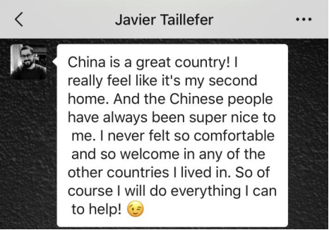 Javier只是我们众多外教的一个代表,他们身处世界十余个国家,通过邮件、微信等方式关心着仍在中国的老师和学生,积极加入到这场没有硝烟的抗“疫”战斗中,为中国抗击疫情加油鼓劲,贡献着自己的力量。相信只要我们携手共进,共度时艰,一定能打赢这场疫情防控阻击战!
