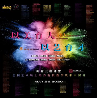 5月26日“以美育人,以艺育才”——优秀作品网络展播,是全国艺术专业学位研究生教育指导委员会选择部分2019年征集的“艺术硕士优秀毕业成果”,集中展示艺术硕士培养院校音乐、戏剧、戏曲、电影、广播电视、舞蹈、美术、艺术设计等八个领域的阶段教学成果。希望通过优秀作品的展播,牢记和弘扬毛主席在延安文艺座谈会上“艺术为人民”的讲话精神,回顾总结艺术硕士教育15年的经验,发挥艺术的审美功能,为以文化人、以美育人奉献一份力量。