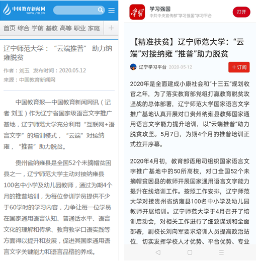 作为辽宁省唯一、首批入选的国家语言文字推广基地,辽宁师范大学积极落实教育部关于打赢教育脱贫攻坚战的总体部署,对接贵州省纳雍县开展国家语言文字能力提升培训。近日,我校“云端推普”助力纳雍脱贫的相关活动受到社会广泛关注,中国教育新闻网、“学习强国”辽宁学习平台、辽宁省教育厅官方微信等多家媒体报道,产生了良好的社会反响。