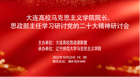 为深入学习贯彻党的二十大精神,10月23日,由辽宁省教育工委宣传部思政处指导、大连高校思政课联盟发起、我校马克思主义学院承办的“大连高校马克思主义学院院长、思政部主任学习党的二十大精神研讨会”在线上召开。辽宁师范大学岳崇兴副校长、辽宁省委教育工委宣传部思政处胡承波部长出席会议并发表致辞,来自大连理工大学、大连海事大学、大连外国语大学、东北财经大学等20多所高校的马克思主义学院院长、思政部主任和马克思主义学院师生近300人参加了此次研讨会。会议由辽宁师范大学马克思主义学院院长李玉珂主持。