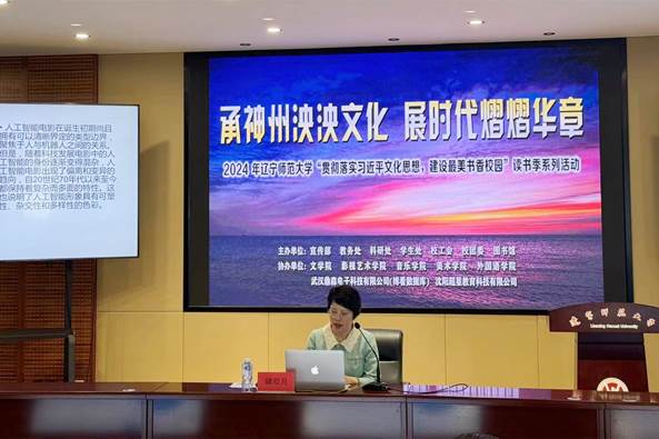 杨春宇作总结发言,从人工智能聚焦人与机器的关系谈起,剖析了电影中人工智能身份混杂的原因及其偏离与变异趋向,阐述了人工智能形象具有的可塑性、杂交性和多样性;同时解读了本年度读书季“承神州泱泱文化,展时代熠熠华章”主题的确立,强调建立健全我国文化服务体系是时代赋予我们的责任,是全校师生丰富精神文化生活的内在要求,是培养面向未来全面发展的社会主义建设者和接班人的重要途径。希望同学们能够继承和发扬中华优秀传统文化,一切向未来,建设最美书香校园!最后,杨春宇馆长宣布本年度读书季闭幕。
