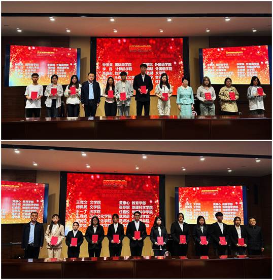 司睿山宣读由校团委、图书馆、校学生会共同发起的辽宁师范大学2023年度“读书达人”评选活动表彰名单;杨峰宣读辽宁师范大学2023年度“最美阅读推广人”表彰名单,储双月、司睿山、杨峰、杨春宇作为颁奖嘉宾为获奖学生读者颁发证书。